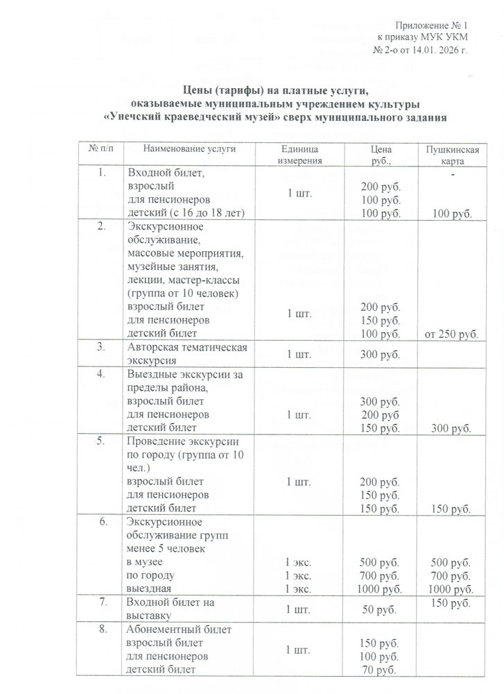 Перечень основных платных услуг, оказываемых МУК "Унечский краеведческий музей"